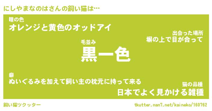 にしやまなのはさんの飼い猫は… 毛並み『黒一色』瞳の色『オレンジと黄色のオッドアイ』猫の品種『日本でよく見かける雑種』 ツクッター #飼い猫ツクッター http://tkutter.nan7.net/kaineko/160762/