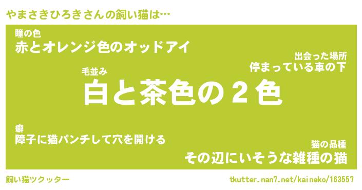 やまさきひろきさんの飼い猫は… 毛並み『白と茶色の2色』瞳の色『赤とオレンジ色のオッドアイ』猫の品種『その辺にいそうな雑種の猫』 ツクッター #飼い猫ツクッター http://tkutter.nan7.net/kaineko/163557/