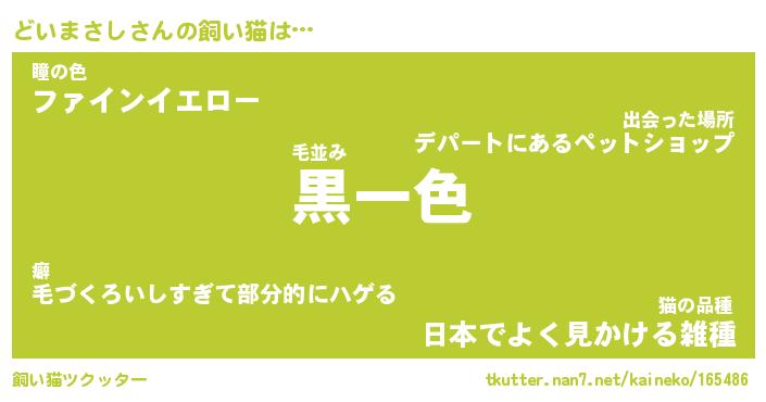 どいまさしさんの飼い猫は… 毛並み『黒一色』瞳の色『ファインイエロー』猫の品種『日本でよく見かける雑種』 ツクッター #飼い猫ツクッター http://tkutter.nan7.net/kaineko/165486/