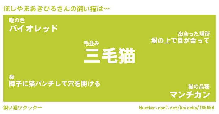 ほしやまあきひろさんの飼い猫は… 毛並み『三毛猫』瞳の色『バイオレッド』猫の品種『マンチカン』 ツクッター #飼い猫ツクッター http://tkutter.nan7.net/kaineko/165954/