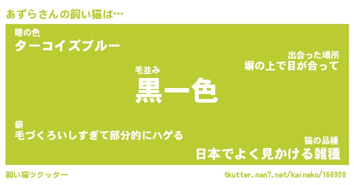 あずらさんの飼い猫は… 毛並み『黒一色』瞳の色『ターコイズブルー』猫の品種『日本でよく見かける雑種』 ツクッター #飼い猫ツクッター http://tkutter.nan7.net/kaineko/166920/