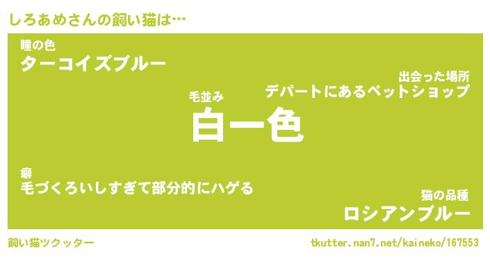 | 意味不明あだ名 | 『ペロリンしろあめ』『永久保存しろあめ』 |