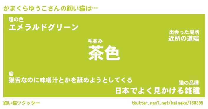 かまくらゆうこさんの飼い猫は… 毛並み『茶色』瞳の色『エメラルドグリーン』猫の品種『日本でよく見かける雑種』 ツクッター #飼い猫ツクッター http://tkutter.nan7.net/kaineko/168395/