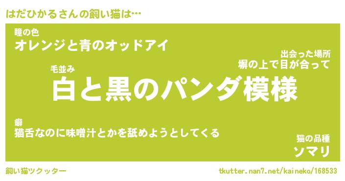 はだひかるさんの飼い猫は… 毛並み『白と黒のパンダ模様』瞳の色『オレンジと青のオッドアイ』猫の品種『ソマリ』 ツクッター #飼い猫ツクッター http://tkutter.nan7.net/kaineko/168533/