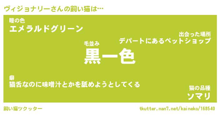 ヴィジョナリーさんの飼い猫は… 毛並み『黒一色』瞳の色『エメラルドグリーン』猫の品種『ソマリ』 ツクッター #飼い猫ツクッター http://tkutter.nan7.net/kaineko/168540/