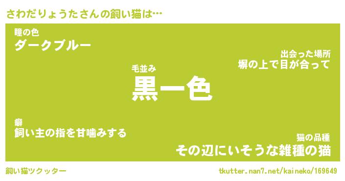 さわだりょうたさんの飼い猫は… 毛並み『黒一色』瞳の色『ダークブルー』猫の品種『その辺にいそうな雑種の猫』 ツクッター #飼い猫ツクッター http://tkutter.nan7.net/kaineko/169649/