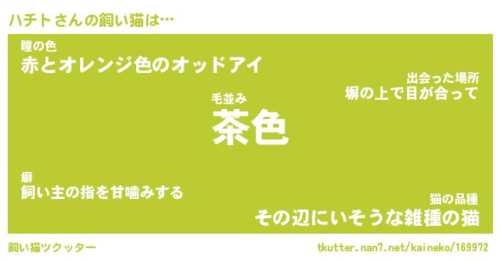 ハチトさんの飼い猫は… 毛並み『茶色』瞳の色『赤とオレンジ色のオッドアイ』猫の品種『その辺にいそうな雑種の猫』 ツクッター #飼い猫ツクッター http://tkutter.nan7.net/kaineko/169972/