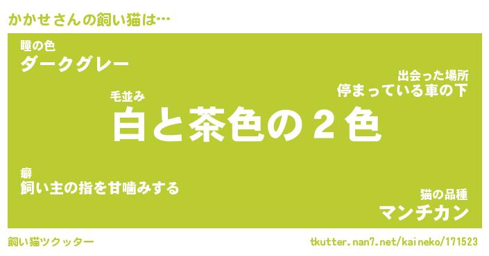 かかせさんの飼い猫は… 毛並み『白と茶色の2色』瞳の色『ダークグレー』猫の品種『マンチカン』 ツクッター #飼い猫ツクッター http://tkutter.nan7.net/kaineko/171523/