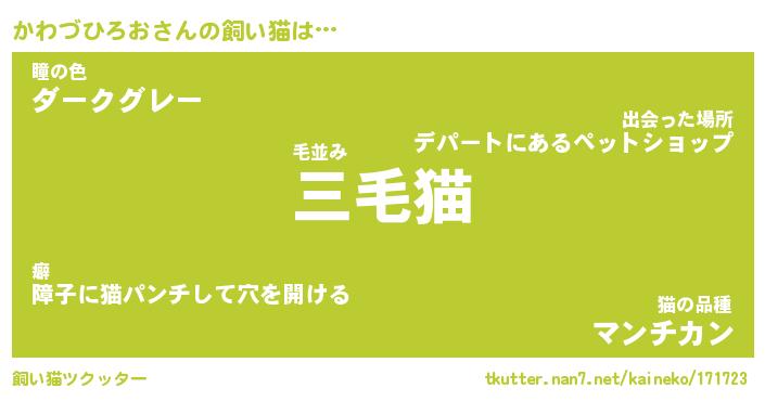 かわづひろおさんの飼い猫は… 毛並み『三毛猫』瞳の色『ダークグレー』猫の品種『マンチカン』 ツクッター #飼い猫ツクッター http://tkutter.nan7.net/kaineko/171723/