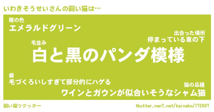 いわきそうせいさんの飼い猫は… 毛並み『白と黒のパンダ模様』瞳の色『エメラルドグリーン』猫の品種『ワインとガウンが似合いそうなシャム猫』 ツクッター #飼い猫ツクッター http://tkutter.nan7.net/kaineko/172607/