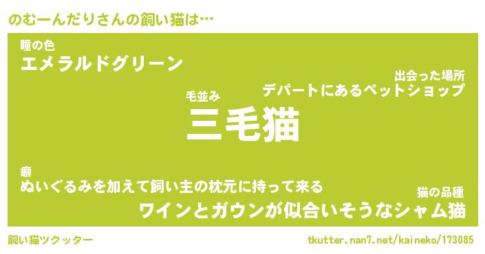 のむーんだりさんの飼い猫は… 毛並み『三毛猫』瞳の色『エメラルドグリーン』猫の品種『ワインとガウンが似合いそうなシャム猫』 ツクッター #飼い猫ツクッター http://tkutter.nan7.net/kaineko/173085/