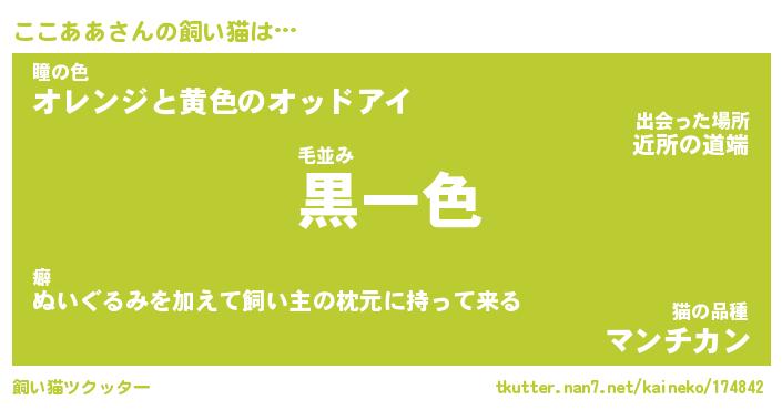 ここああさんの飼い猫は… 毛並み『黒一色』瞳の色『オレンジと黄色のオッドアイ』猫の品種『マンチカン』 ツクッター #飼い猫ツクッター http://tkutter.nan7.net/kaineko/174842/