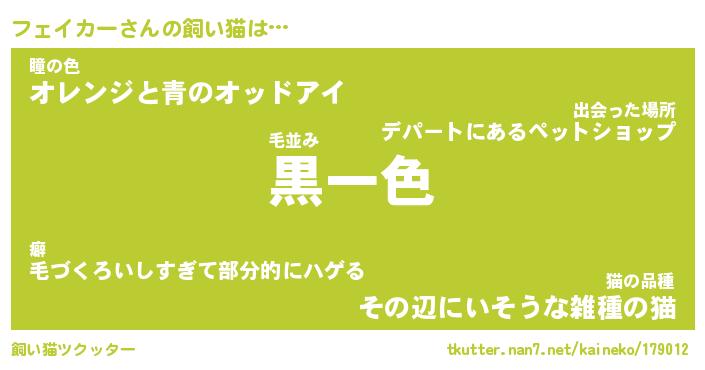 フェイカーさんの飼い猫は… 毛並み『黒一色』瞳の色『オレンジと青のオッドアイ』猫の品種『その辺にいそうな雑種の猫』 ツクッター #飼い猫ツクッター http://tkutter.nan7.net/kaineko/179012/