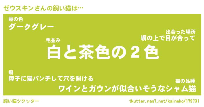 ゼウスキンさんの飼い猫は… 毛並み『白と茶色の2色』瞳の色『ダークグレー』猫の品種『ワインとガウンが似合いそうなシャム猫』 ツクッター #飼い猫ツクッター http://tkutter.nan7.net/kaineko/179731/