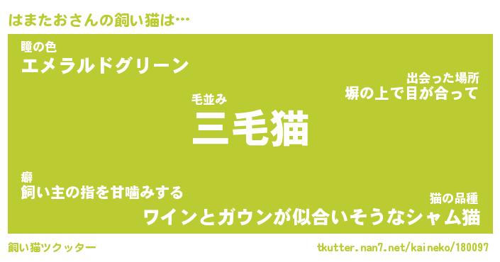 はまたおさんの飼い猫は… 毛並み『三毛猫』瞳の色『エメラルドグリーン』猫の品種『ワインとガウンが似合いそうなシャム猫』 ツクッター #飼い猫ツクッター http://tkutter.nan7.net/kaineko/180097/