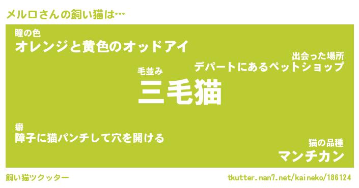 メルロさんの飼い猫は… 毛並み『三毛猫』瞳の色『オレンジと黄色のオッドアイ』猫の品種『マンチカン』 ツクッター #飼い猫ツクッター http://tkutter.nan7.net/kaineko/186124/