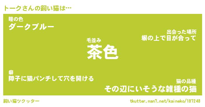 トークさんの飼い猫は… 毛並み『茶色』瞳の色『ダークブルー』猫の品種『その辺にいそうな雑種の猫』 ツクッター #飼い猫ツクッター http://tkutter.nan7.net/kaineko/187248/