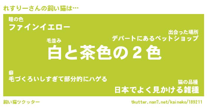 れすりーさんの飼い猫は… 毛並み『白と茶色の2色』瞳の色『ファインイエロー』猫の品種『日本でよく見かける雑種』 ツクッター #飼い猫ツクッター http://tkutter.nan7.net/kaineko/189211/