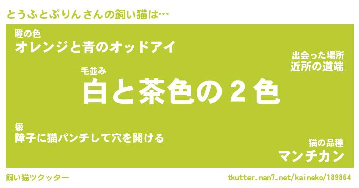 とうふとぷりんさんの飼い猫は… 毛並み『白と茶色の2色』瞳の色『オレンジと青のオッドアイ』猫の品種『マンチカン』 ツクッター #飼い猫ツクッター http://tkutter.nan7.net/kaineko/189864/
