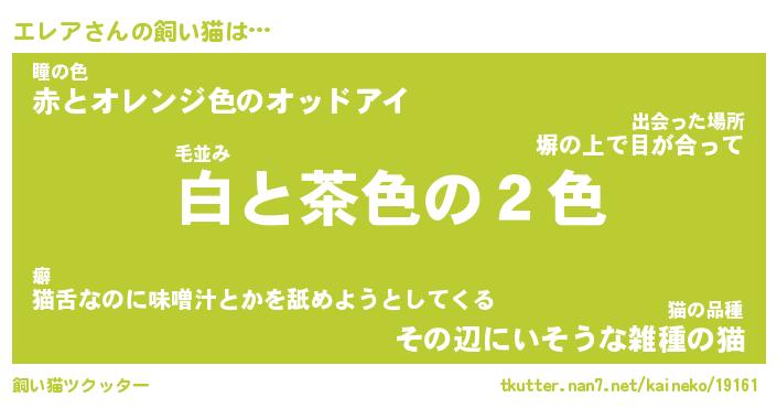 エレアさんの飼い猫は… 毛並み『白と茶色の2色』瞳の色『赤とオレンジ色のオッドアイ』猫の品種『その辺にいそうな雑種の猫』 ツクッター #飼い猫ツクッター http://tkutter.nan7.net/kaineko/19161/