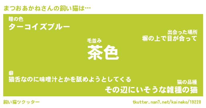 まつおあかねさんの飼い猫は… 毛並み『茶色』瞳の色『ターコイズブルー』猫の品種『その辺にいそうな雑種の猫』 ツクッター #飼い猫ツクッター http://tkutter.nan7.net/kaineko/19228/