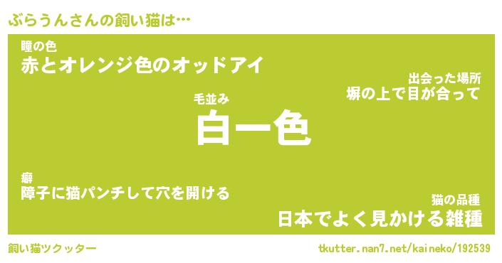 ぶらうんさんの飼い猫は… 毛並み『白一色』瞳の色『赤とオレンジ色のオッドアイ』猫の品種『日本でよく見かける雑種』 ツクッター #飼い猫ツクッター http://tkutter.nan7.net/kaineko/192539/