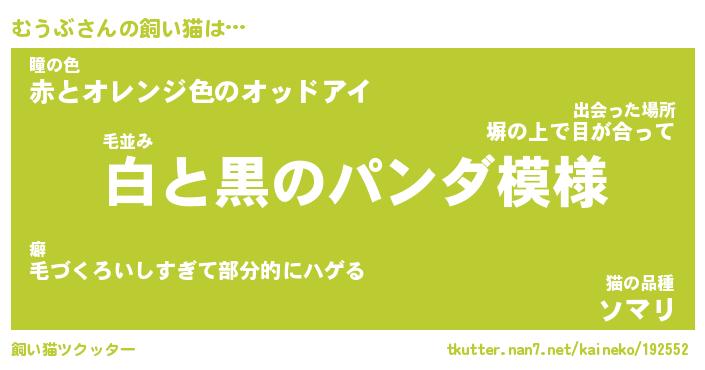 むうぶさんの飼い猫は… 毛並み『白と黒のパンダ模様』瞳の色『赤とオレンジ色のオッドアイ』猫の品種『ソマリ』 ツクッター #飼い猫ツクッター http://tkutter.nan7.net/kaineko/192552/