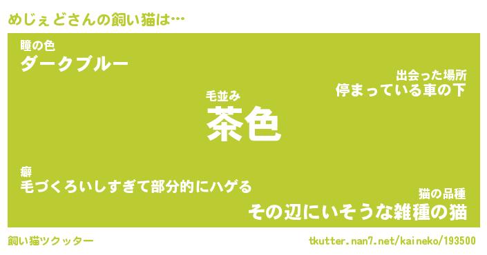 めじぇどさんの飼い猫は… 毛並み『茶色』瞳の色『ダークブルー』猫の品種『その辺にいそうな雑種の猫』 ツクッター #飼い猫ツクッター http://tkutter.nan7.net/kaineko/193500/