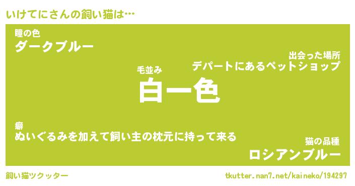 いけてにさんの飼い猫は… 毛並み『白一色』瞳の色『ダークブルー』猫の品種『ロシアンブルー』 ツクッター #飼い猫ツクッター http://tkutter.nan7.net/kaineko/194297/