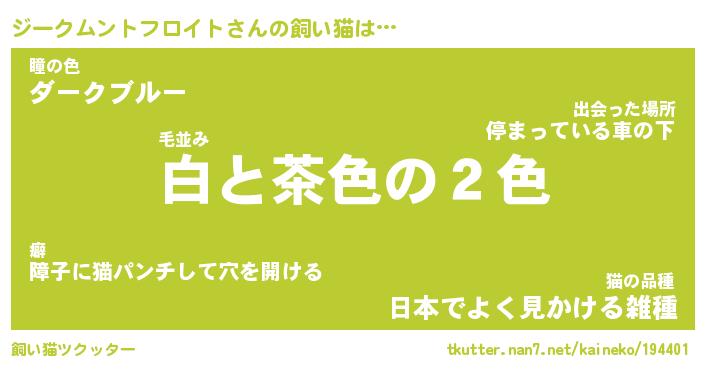 ジークムントフロイトさんの飼い猫は… 毛並み『白と茶色の2色』瞳の色『ダークブルー』猫の品種『日本でよく見かける雑種』 ツクッター #飼い猫ツクッター http://tkutter.nan7.net/kaineko/194401/