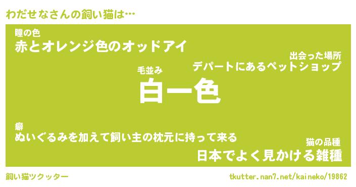 わだせなさんの飼い猫は… 毛並み『白一色』瞳の色『赤とオレンジ色のオッドアイ』猫の品種『日本でよく見かける雑種』 ツクッター #飼い猫ツクッター http://tkutter.nan7.net/kaineko/19862/