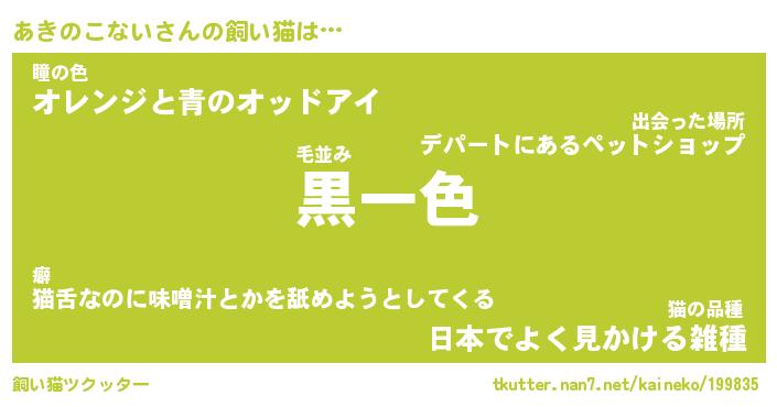 あきのこないさんの飼い猫は… 毛並み『黒一色』瞳の色『オレンジと青のオッドアイ』猫の品種『日本でよく見かける雑種』 ツクッター #飼い猫ツクッター http://tkutter.nan7.net/kaineko/199835/