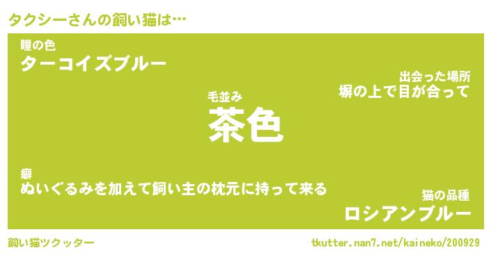 タクシーさんの飼い猫は… 毛並み『茶色』瞳の色『ターコイズブルー』猫の品種『ロシアンブルー』 ツクッター #飼い猫ツクッター http://tkutter.nan7.net/kaineko/200929/