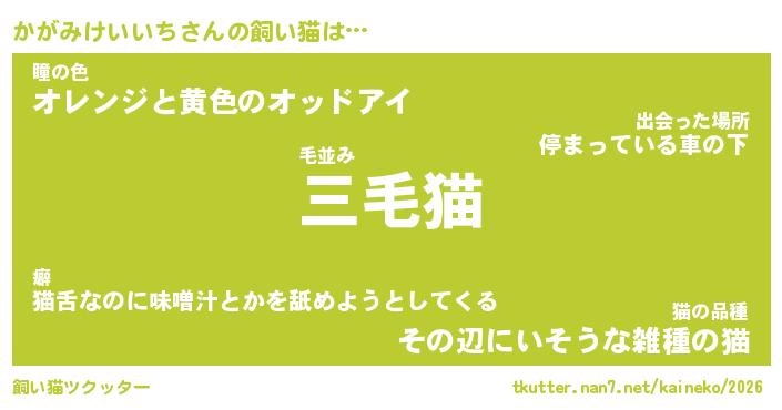 かがみけいいちさんの飼い猫は… 毛並み『三毛猫』瞳の色『オレンジと黄色のオッドアイ』猫の品種『その辺にいそうな雑種の猫』 ツクッター #飼い猫ツクッター http://tkutter.nan7.net/kaineko/2026/