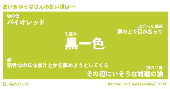 おいきゆうなさんの飼い猫は… 毛並み『黒一色』瞳の色『バイオレッド』猫の品種『その辺にいそうな雑種の猫』 ツクッター #飼い猫ツクッター http://tkutter.nan7.net/kaineko/204309/