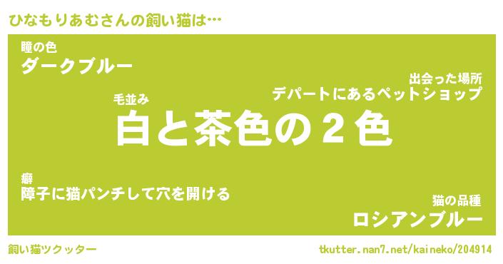 ひなもりあむさんの飼い猫は… 毛並み『白と茶色の2色』瞳の色『ダークブルー』猫の品種『ロシアンブルー』 ツクッター #飼い猫ツクッター http://tkutter.nan7.net/kaineko/204914/