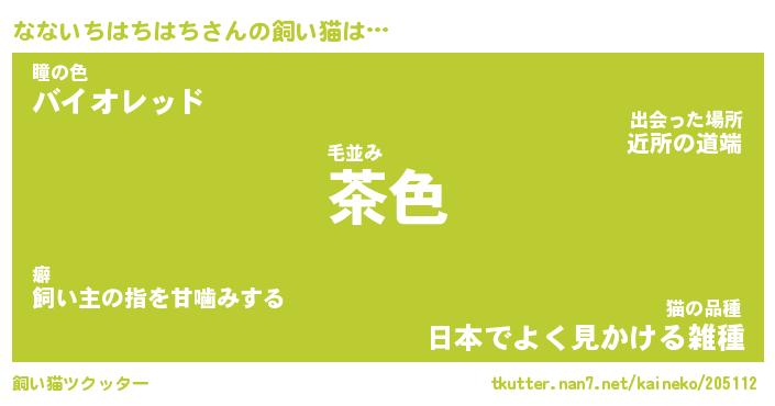 なないちはちはちさんの飼い猫は… 毛並み『茶色』瞳の色『バイオレッド』猫の品種『日本でよく見かける雑種』 ツクッター #飼い猫ツクッター http://tkutter.nan7.net/kaineko/205112/