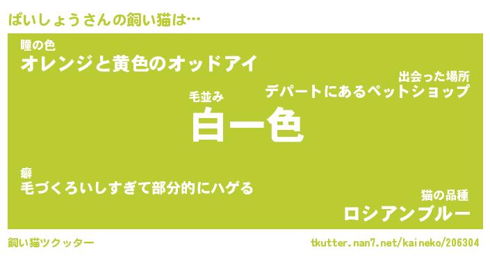 ばいしょうさんの飼い猫は… 毛並み『白一色』瞳の色『オレンジと黄色のオッドアイ』猫の品種『ロシアンブルー』 ツクッター #飼い猫ツクッター http://tkutter.nan7.net/kaineko/206304/