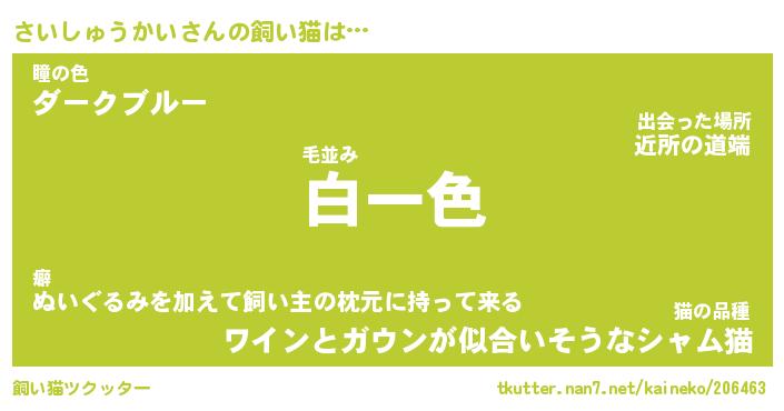 さいしゅうかいさんの飼い猫は… 毛並み『白一色』瞳の色『ダークブルー』猫の品種『ワインとガウンが似合いそうなシャム猫』 ツクッター #飼い猫ツクッター http://tkutter.nan7.net/kaineko/206463/