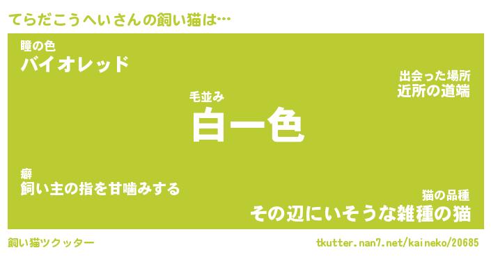 てらだこうへいさんの飼い猫は… 毛並み『白一色』瞳の色『バイオレッド』猫の品種『その辺にいそうな雑種の猫』 ツクッター #飼い猫ツクッター http://tkutter.nan7.net/kaineko/20685/