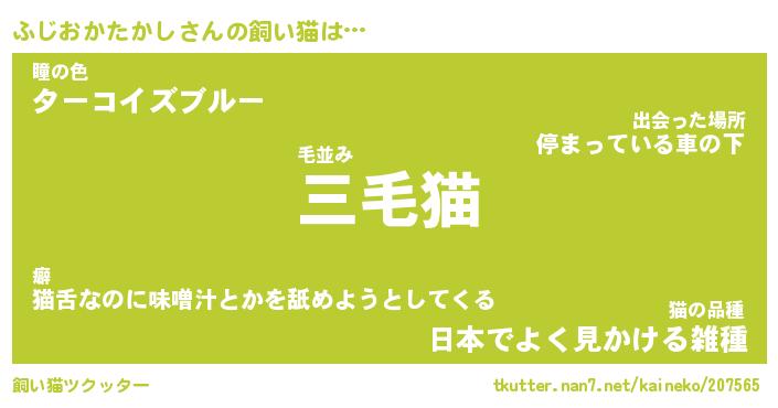 ふじおかたかしさんの飼い猫は… 毛並み『三毛猫』瞳の色『ターコイズブルー』猫の品種『日本でよく見かける雑種』 ツクッター #飼い猫ツクッター http://tkutter.nan7.net/kaineko/207565/