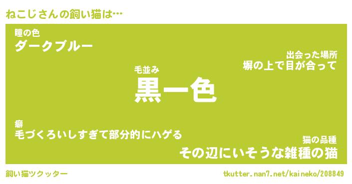 ねこじさんの飼い猫は… 毛並み『黒一色』瞳の色『ダークブルー』猫の品種『その辺にいそうな雑種の猫』 ツクッター #飼い猫ツクッター http://tkutter.nan7.net/kaineko/208849/