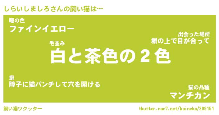 しらいしましろさんの飼い猫は… 毛並み『白と茶色の2色』瞳の色『ファインイエロー』猫の品種『マンチカン』 ツクッター #飼い猫ツクッター http://tkutter.nan7.net/kaineko/209151/