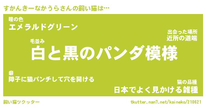 すかんきーなかうらさんの飼い猫は… 毛並み『白と黒のパンダ模様』瞳の色『エメラルドグリーン』猫の品種『日本でよく見かける雑種』 ツクッター #飼い猫ツクッター http://tkutter.nan7.net/kaineko/210621/