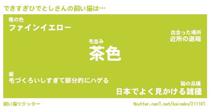 できすぎひでとしさんの飼い猫は… 毛並み『茶色』瞳の色『ファインイエロー』猫の品種『日本でよく見かける雑種』 ツクッター #飼い猫ツクッター http://tkutter.nan7.net/kaineko/211167/