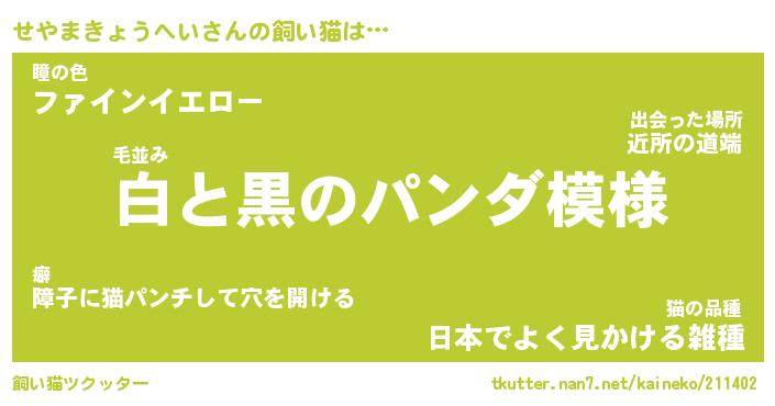 せやまきょうへいさんの飼い猫は… 毛並み『白と黒のパンダ模様』瞳の色『ファインイエロー』猫の品種『日本でよく見かける雑種』 ツクッター #飼い猫ツクッター http://tkutter.nan7.net/kaineko/211402/