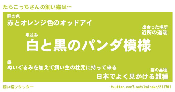 たらこっちさんの飼い猫は… 毛並み『白と黒のパンダ模様』瞳の色『赤とオレンジ色のオッドアイ』猫の品種『日本でよく見かける雑種』 ツクッター #飼い猫ツクッター http://tkutter.nan7.net/kaineko/211701/