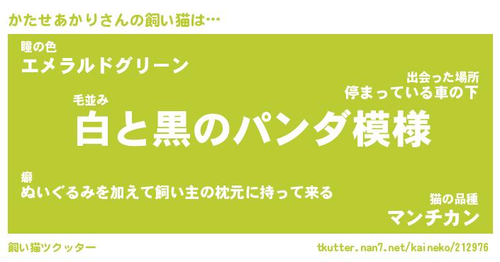 かたせあかりさんの飼い猫は… 毛並み『白と黒のパンダ模様』瞳の色『エメラルドグリーン』猫の品種『マンチカン』 ツクッター #飼い猫ツクッター http://tkutter.nan7.net/kaineko/212976/