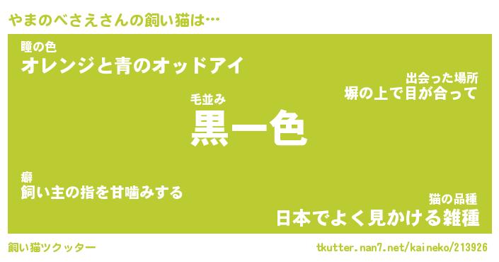 やまのべさえさんの飼い猫は… 毛並み『黒一色』瞳の色『オレンジと青のオッドアイ』猫の品種『日本でよく見かける雑種』 ツクッター #飼い猫ツクッター http://tkutter.nan7.net/kaineko/213926/