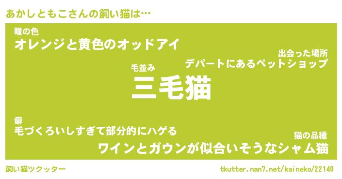 あかしともこさんの飼い猫は… 毛並み『三毛猫』瞳の色『オレンジと黄色のオッドアイ』猫の品種『ワインとガウンが似合いそうなシャム猫』 ツクッター #飼い猫ツクッター http://tkutter.nan7.net/kaineko/22140/